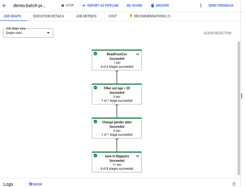 แล้วก็มาถึงส่วนสำคัญของเรา Pipeline นั้นเอง จะมีการตั้งค่า Pipeline อยู่ใน beam.Pipeline เพื่อบ่งบอกว่าเราจะทำการรันที่ Cloud Dataflow ผ่าน Arguments ที่ได้มาก่อนหน้านี้ ส่วนลำดับการทำงาน Pipeline ก็ตามที่เราได้ Label ไว้ ส่วน Plugin ทั้ง Input และ Output มีอะไรบ้างสามารถเช็คใน Official Document อยู่ด้านล่างบทความ