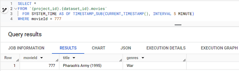 FOR SYSTEM_TIME AS OF TIMESTAMP_SUB(CURRENT_TIMESTAMP(), INTERVAL 5 MINUTE)