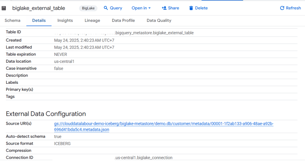 เพียงเท่านี้เราก็จะได้ Bigquery Iceberg table มาแล้วจะเห็นได้ว่าเราสามารถ Insert ข้อมูลได้ไม่เหมือนกับ Metastore ที่เราเขียนไปก่อนหน้า