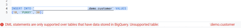 อย่างที่บอกว่าพอเราใช้ Bigquery metastore เราจะไม่สามารถเขียน DML (data manipulate) ได้เช่น Insert update ก็อย่างที่จะได้เห็นทาง Bigquery จะ show error มาเลย